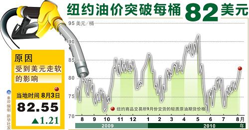 由于利好經濟數據和強勁歐洲銀行業績提振了投資者信心,8月2日紐約商品交易所油價大幅攀升,突破每桶80美元關口,收于每桶81.34美元,為近三個月以來的最高水平。8月3日,延續漲勢,紐交所油價收于每桶82.55美元。8月4日,小幅下跌,紐交所9月份交貨的輕質原油期貨價格跌8美分,至每桶82.47美元。
