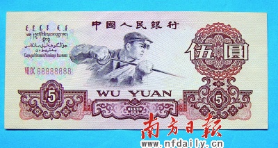 被收藏界稱為“豹號”的8個“8”連號人民幣現身云浮。日前,來自該市羅定的民間收藏家王河先生向記者展示其收藏的8個“8”連號的人民幣,該幣為1960年版的第三套人民幣5元紙幣,已退出流通領域。據了解,該5元幣曾獲世界紙幣設計金獎。8個“8”的吉祥號碼被收藏界稱之為“豹號”,向來難得一見,目前已有來自茂名的收藏愛好者開價88888元求購。(記者/楊紅雨特約通訊員/廖榮波)