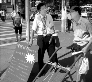 男子胳膊上挎著一個(gè)紅色拎包,里面裝滿資料和表格,他手拿一份資料,逢人便攔,以這些價(jià)格不菲的禮品誘惑他們停下腳步,聽他把開戶炒股的好處一一道來。心動(dòng)的路人不多,無奈之下,他連手推兩輪車忙著送貨的人也不錯(cuò)過。昨天,記者從國信證券了解到,由于市場表現(xiàn)不好,的確有很多業(yè)務(wù)員上街送禮促銷,至于送禮價(jià)值大小,則由業(yè)務(wù)員自行決定,公司的統(tǒng)一政策是,免除新開戶兩市總計(jì)90元的開戶費(fèi)。