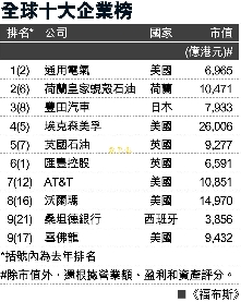據香港《文匯報》消息,《福布斯》根據綜合評分定出是項排名,營業額、盈利、資產和市值占同等比重。三甲位置分別由美國通用電氣、荷蘭皇家蜆殼石油和日本豐田汽車奪得,十大位置中,美國占了5席。