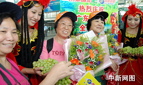中新網廣州7月31日電 (莫非 林月明)在廣州白云機場出發廳,身著漂亮維族服飾的姑娘熱情地將繽紛美麗的鮮花送給游客,盛情邀約廣東游客赴美麗的新疆旅游。這是自“7·5”事件后,廣東首批赴新疆旅游的游客上航班前經歷的一幕,意味著暫時停滯了近一個月的廣東新疆游市場,終于全面恢復正常。