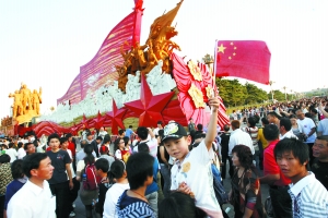 “黃金周”期間,天安門廣場人流如織,中外游客超過820萬人次,超過2008年國慶黃金周北京接待的游客總人數。北京市旅游局統(tǒng)計,北京203個主要景點接待游客的總量突破了950萬人次。