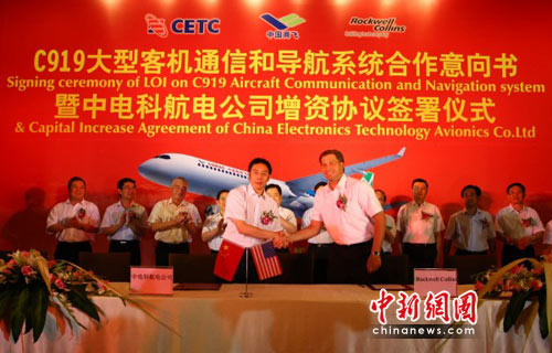 中新網成都6月26日電(周迪迪)26日,“C919大型客機通信和導航系統合作意向書暨中電科航空電子有限公司增資協議簽署儀式”26日在成都舉行。國產C919大型客機的航空電子通信和導航系統合作意向書的簽署,標志著中國國產大型客機通信和導航系統的供應商選擇和國內外供應商合作取得了重大進展,也意味著國產大飛機通信和導航系統國內供應商已基本確定。