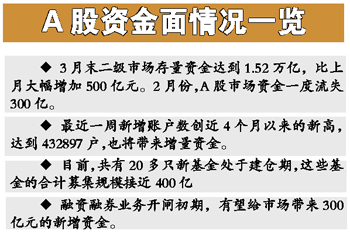 由上海證券報和申銀萬國研究所聯(lián)合推出的股市月度資金報告顯示,今年3月末,A股市場的存量資金在經(jīng)歷了近3個月的盤底振蕩后開始上升,當(dāng)月末二級市場存量資金達到1.52萬億,比上月大幅增加500億元。這個跡象,使得二月份一度明顯流失的市場資金面再度回穩(wěn),此前的2月份,A股市場資金一度流失300億。