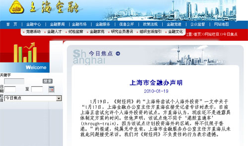 據上海金融辦網站刊出的聲明指出,《財經網》有關“上海將嘗試個人海外投資”的報道,純屬“無中生有”,上海市金融服務辦公室主任方星海,從未就此問題接受采訪,對《財經網》不負責任的行為,表示遺憾。