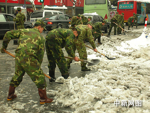 杭州積雪嚴重,武警官兵冒著嚴寒鏟雪