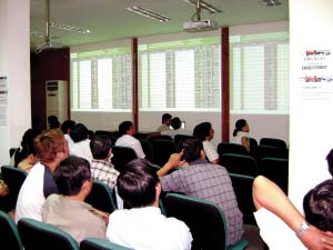 ORS證券公司位于胡志明市第一郡,與胡志明證券交易所一街之隔。隨著越南指數(shù)從2007年3月12日的歷史最高點(diǎn)1170點(diǎn)跌至今年6月的370點(diǎn)低位,幾月以來,這里已經(jīng)成了大多數(shù)股民的“傷心地”。不過,昨天上午9點(diǎn),想在這里找到一個位子已經(jīng)不太容易。而交易大廳偶爾響起的掌聲更將人們心頭的陰霾一掃而空,“漲了。”幾個股民對自己的收獲很滿意。