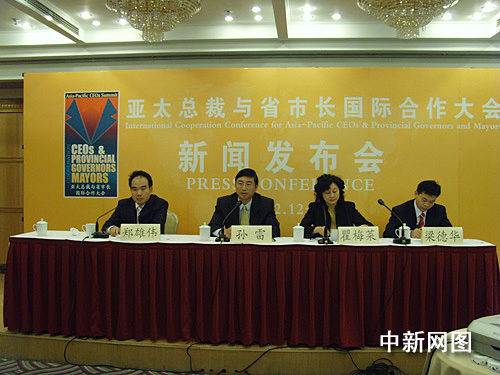 中新網11月28日電 今日下午,亞太總裁協會與廣州市人民政府聯合在京宣布:第三屆亞太總裁與省市長國際合作大會將于今年12月12日-14日在中國第三大經濟中心城市廣州市隆重舉辦。亞太總裁協會全球執行主席鄭雄偉及第三屆亞太總裁與省市長國際合作大會組委會辦公室主任、廣州市對外貿易經濟合作局副局長孫雷等出席了當天發布會并接受記者提問。