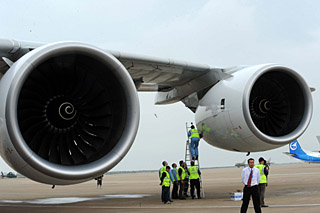 被譽為“空中巨無霸”的空客A380型客機在珠海機場參加今年的第七屆珠海航展。新華社記者 周文杰 攝