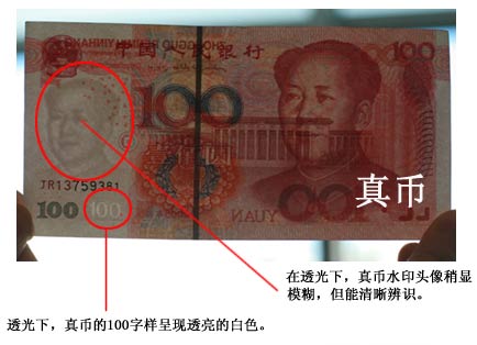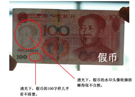 一看。即看鈔票上的固定人像水印、白水印、光變油墨面額數字、交印對應圖案、隱形面額數字等特征。據介紹,真鈔票的“固定人像水印”有立體感,清晰度高,“白水印”的高透光反光性強,“交印對應圖案”是一個圓形方孔錢。這三處在迎光透視時都可以清楚看見;光源角度發生改變時,真幣的“光變油墨面額數字”會有綠色和藍色顏色的漸變;此外,在與眼睛平行上下抖動時,可以看到“100”的隱形面額數字。