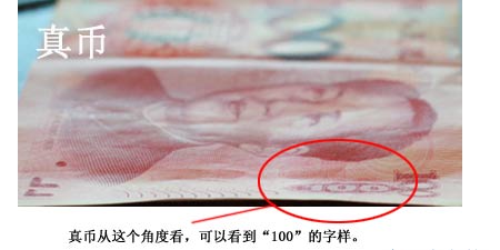 四測。市民可用紫光燈、驗鈔機等簡單工具檢驗鈔票真假,真幣鈔面“中國人民銀行”字樣下有一個金色的“100”,通過驗鈔機時機器不會發出聲響。假鈔在紫光燈照射下看不見這個“100”數字,用驗鈔機檢驗時,驗鈔機會發出滴滴的警報聲。