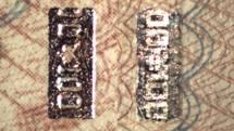 第四種偽造安全線是第二種和第三種的組合,既有燙印開窗,又有實(shí)物安全線置于紙張夾層內(nèi)。(見下圖)
