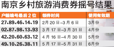 此次發放活動的旅游券消費時間為3月-6月,不過鄉村旅游消費券標有使用月份,按月使用,有效期為當月。本次搖號方式,根據江南八區居民戶口簿編號的最后兩位數字進行搖號,分別搖出3、4、5、6月份鄉村旅游消費券的發放戶口簿號碼,每個月為一組,每組為5個號碼。