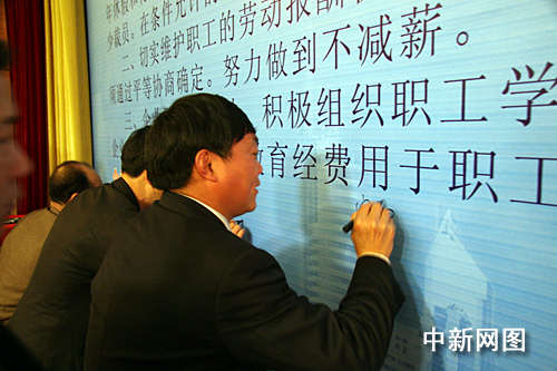 記者在現(xiàn)場(chǎng)看到,《共同約定書》中企業(yè)方的承諾主要是:企業(yè)依法采取縮短工時(shí),適時(shí)安排年休假和特別休假、輪崗輪休等形式保障職工崗位,做到不減薪、不裁員或少裁員。企業(yè)要組織職工學(xué)習(xí)新技術(shù),而且企業(yè)教育經(jīng)費(fèi)用于職工培訓(xùn)不少于70%。另一方面,職工方作出了立足本職、愛崗敬業(yè)、積極為企業(yè)發(fā)展獻(xiàn)計(jì)出力等承諾。