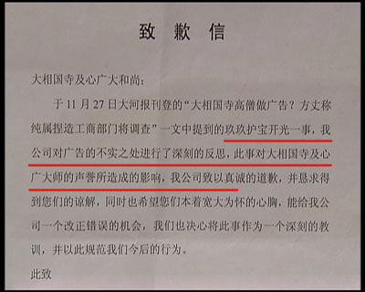 就在記者對玖玖理療褲的虛假廣告進行調查時,河南開封大相國寺向記者出具了一份玖玖理療褲河南開封經銷商,寫給大相國寺的一封致歉信,承認自己假冒僧人的錯誤行為,從此廣告中來自大相國寺的高僧空智,就如同人間蒸發,再也沒有出現過,取而代之的是佛教禪宗第36代傳人,但卻有著相同的名字和面孔——空智。