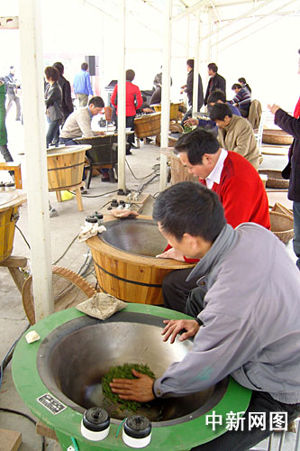 3月25日上午8時,剛下過濛濛細雨的天空漸漸放晴,西湖區2009年西湖龍井“炒茶王”爭霸賽在龍塢茶葉交易中心順利舉行。說來也巧,在首輪抽簽環節中,兩位往年的“炒茶王”相繼抽到了1號和2號,面對面地形成了“炒茶王”爭霸賽的第一個高潮——“雙王爭霸”的精彩場面。為公平比賽,此次所有參賽選手炒制的青葉原料都來自同一塊茶地。比賽中,每位選手都領到了2斤青葉,在經過殺青、輝鍋、整理、二次輝鍋等工序后,以抽簽號裝袋后送由國家級一、二級評茶師和龍井茶葉產業協會秘書長等評茶高手組成的評審團評審。評審團則通過觀、聞、品等方法,對各位選手炒制的茶葉外形、香氣、滋味、湯色、葉底等進行打分,最后以綜合得分的高低產生“炒茶王”。