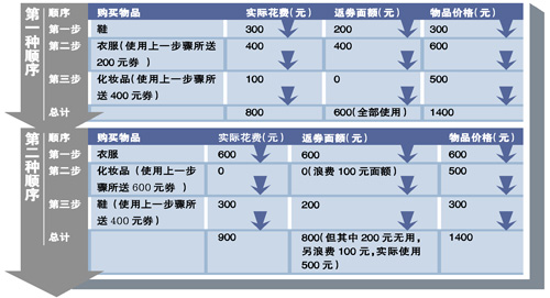 比如,一家商場推出買消費滿200元返100元消費券的活動,咋看好像是五折優惠,其實是6.67折。應該這樣計算:200÷(200+100)=0.67,即6.67折。在返券比例相同的情況下,起點越低對消費者越有利。