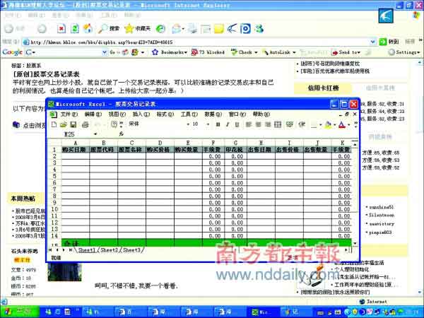 這張受到熱烈追捧的帖子,發表在某著名理財網站股票頻道。帖子中網友“WYI520”稱自己因為偶爾也上網炒股,為了使得自己的交易狀況、成本等一目了然,特意制作了一個簡單的電子賬簿,并上傳在網站上和大家一起分享。記者下載這份“賬簿”后發現,它僅僅是一個最為簡單的EXCEL表格,共分為15項內容,包括購入的股票代碼、名稱,購入價格、數量,手續費印花稅,賣出的時間、數量、價格,最終的利潤等等,總之,股票交易整個環節中的主要參數都是這份小賬簿記錄的內容。