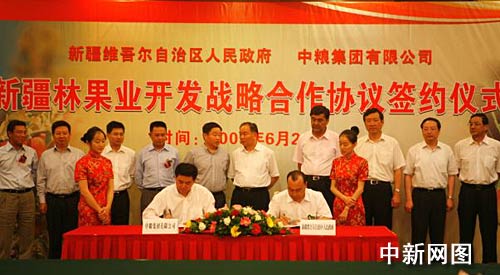 中新網烏魯木齊6月24日電 (記者 汪金生) 新疆維吾爾自治區政府24日與中糧集團簽署《新疆林果業開發戰略合作協議》,這次簽約是中糧集團與新疆在番茄、制糖、油脂、飲料等業務開展合作基礎上的又一項重要合作,拉開了中糧集團全面進軍新疆林果業開發的序幕,奠定了新疆林果業產業升級、做大做強的基礎。