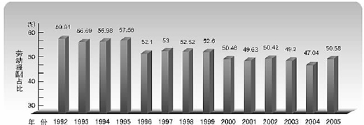 從國際口徑統計結果看,我國勞動報酬占比的基本走勢和國內口徑統計相一致,但差距縮小。從1992年到2005年,除了2003年、2004年低于50%外,其他年份勞動報酬占比均在50%以上。