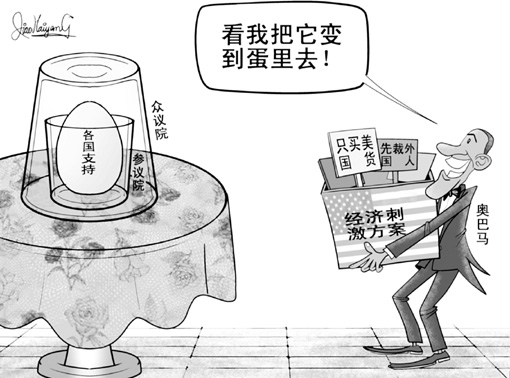 我們有必要注意奧巴馬總統(tǒng)的微妙處境。對(duì)于美國(guó)國(guó)會(huì)討論中的“買美國(guó)貨”條款,世界各國(guó)可謂是軟硬兼施。一方面,各國(guó)紛紛表示了強(qiáng)烈的反對(duì)聲音,并揚(yáng)言報(bào)復(fù)。但在另一方面,各國(guó)政要和媒體又表達(dá)了對(duì)魅力領(lǐng)袖奧巴馬的厚望。正如朝日新聞社在2月6日的社論所指出的,世界各國(guó)對(duì)奧巴馬的厚愛(ài),使得他處于一種很微妙的政治立場(chǎng)。國(guó)內(nèi)形勢(shì)敦促他支持一定程度的貿(mào)易保護(hù)主義政策;而他國(guó)人們則期待新總統(tǒng)實(shí)踐在競(jìng)選中承諾的自由主義外交政策。