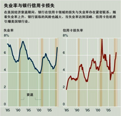 隨著美國(guó)失業(yè)率飆升至8.9%達(dá)53.9萬(wàn)人時(shí),許多信用卡持卡人陷入財(cái)政困境,無(wú)力償還欠款。更多的失業(yè)意味著更多的銀行損失。專(zhuān)家預(yù)測(cè),很快會(huì)有上百萬(wàn)美國(guó)人無(wú)力償還信用卡債務(wù),對(duì)發(fā)卡銀行來(lái)說(shuō),這是持卡人給他們挖的一個(gè)“新坑”,信用卡損失正成為美國(guó)銀行業(yè)面臨的新挑戰(zhàn)。