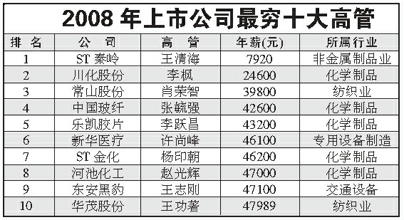 根據(jù)這份榜單,2008年上市公司最窮總經(jīng)理30人的平均年薪是56373元,而最窮總經(jīng)理前十名的平均年薪只有39251元。