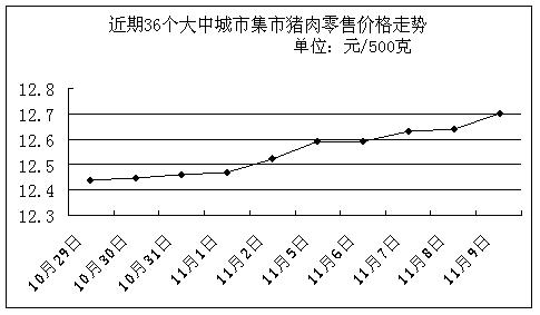 中新網11月12日電 國家發改委網站發布消息稱,據國家發展改革委價格監測中心監測,上周(11.5-11.9,下同)全國36個大中城市豬肉(精瘦肉)集市平均零售價格每500克為12.63元,比上期(10.29-11.2,下同)上漲1.28%。