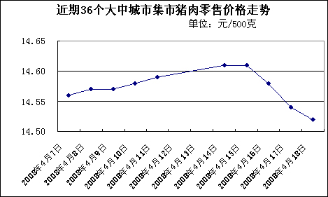 中新網4月21日電 中國國家發改委網站消息,據發改委價格監測中心監測顯示,上周(2008.4.14-2008.4.18,下同)中國36個大中城市集市豬肉(精瘦肉)平均零售價格每500克為14.57元,與前一周(2008.4.7-2008.4.11,下同)持平。