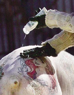 在位于豬圈隔壁的工作室,記者看到了工人為名叫“美人魚”的豬文身的過程。