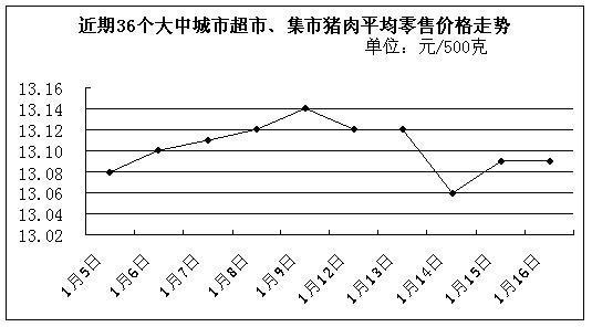 中新網1月19日電 據國家發展改革委價格監測中心監測,上周(1月12日-1月16日)36個大中城市超市、集市豬肉(精瘦肉)平均零售價格每500克為13.10元,比前一周(1月5日-1月9日,下同)下降0.08%。