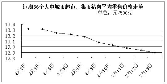 中新網2月16日電 據國家發展改革委價格監測中心監測,上周(2月9日-2月13日)36個大中城市超市、集市豬肉(精瘦肉)平均零售價格每500克為12.99元,比前一周(2月2日-2月6日,下同)下降2.04%。