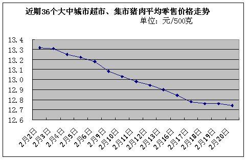 中新網2月23日電 據國家發展改革委價格監測中心監測,上周(2009年2月16日~2009年2月20日,下同)全國36個大中城市集市、超市豬肉(精瘦肉)平均零售價格每500克為12.78元,與前一周(2009年2月9日~2009年2月13日,下同)相比下降1.62%。
