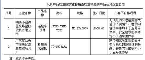玩具產品質量國家監督抽查質量較差的產品及其企業名單