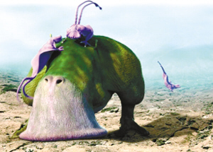 食草動物像吸塵器 在霍金的宇宙中,火星、月球等類地行星上生活著兩只腳的食草動物。它們能利用吸塵器般的巨型嘴巴從巖石的縫隙中吸食食物。類地行星上還存在類似蜥蜴的食肉動物,雙方偶爾爆發獵食大戰。