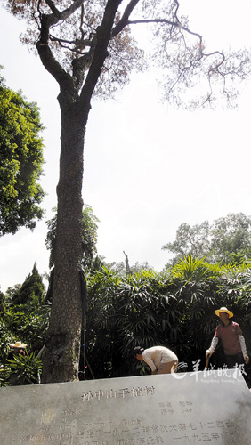 這株名木被稱為“廣州市區內年齡最大的馬尾松 ”,已有106歲。主干胸徑已長到200厘米,需要兩個人才能環抱住。有人會覺得奇怪,手植松距今才98年,怎么會多了8年?公園管理人員解釋,1912 年,孫中山先生親臨黃花崗植樹時,樹苗已8歲。當年,孫中山先生一共種了四棵馬尾松樹,目前僅這一棵幸存。“簡直就是‘大熊貓’,這棵馬尾松有特殊的紀念意義”。