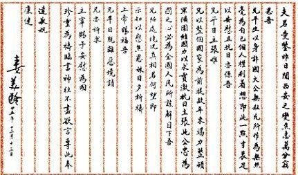 兄不自檢束,竟遭不測之禍,致令至愛憂傷,罪何可言。今事既至此,惟有不愧為吾妻之丈夫,亦不愧負吾總理與吾父吾母一生之教養,必以清白之身還我先生,只求不愧不怍無負上帝神明而已。家事并無掛念,惟經國與緯國兩兒皆為兄之子,亦即吾妻之子,萬望至愛視如己出,以慰吾靈。經兒遠離十年,其近日性情如何,兄固不得而知;惟緯兒至孝知義,其必能克盡孝道。彼于我遭難前一日尚來函,極欲為吾至愛盡其孝道也。彼現駐柏林,通信可由大使館轉。甚望吾至愛能去電以慰之為感。