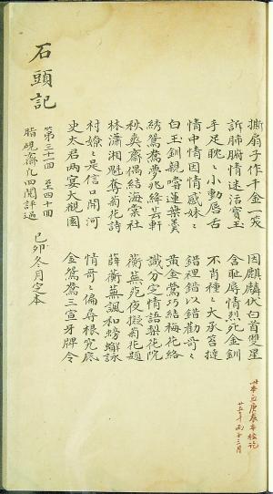 庚辰本存七十八回(1-80回,內缺64、67兩回),此本第41回以后的四個總目錄頁上題有“庚辰秋(月)定本”字樣,故通稱“庚辰本”。此本亦有與己卯本相同的雙行小字批,另有大量的行間批和眉批。此本部分手抄筆記與己卯本相同,行款題字、少數抄漏空行、抄胥提示,甚至個別如“祥”字的避諱均與己卯本相同,昭示這兩個本子間的特殊密切關系,由此本可窺視己卯本的大略。此本批語中資料豐富,價值極高。人民文學出版社1982年首版,迄今印行已逾400萬套的《紅樓夢》校注本的前八十回即以庚辰本為底本(后四十回以程甲本為底本)。庚辰本1933年徐星署花八塊大洋,購于隆福寺;后燕京大學圖書館以二兩黃金輾轉購得,現由北京大學圖書館珍藏。