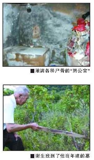 終于等來了曾做過“土公”的謝生。謝生今年76歲了,稍稍有些駝背,走路有些緩慢,但老人的頭腦非常清楚,眼中閃爍著令人敬畏的智慧的光芒。對記者提出的問題,老人回答得非常準(zhǔn)確,不夸大事實,如果不知道也不妄加猜測。“我只搬過不到10個‘黃金甕’,都搬到鷓鴣山了。另一位‘土公’謝興搬得多,得有100多個,可惜他已經(jīng)去世了。看到的‘黃金’很多都爛掉了,大部分只剩下了腿骨和手臂,少部分還存有一點點頭皮骨——腿骨和天靈蓋鈣質(zhì)比較多,所以一般保存得長久一些。腿骨很短,也就一個半拳頭長”,老人邊說邊用兩個拳頭在自己的小腿前比畫著。