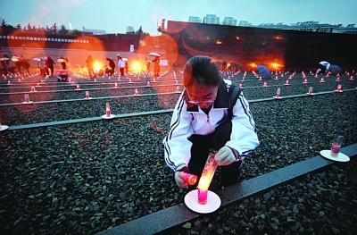 “我們共風雨,我們共追求,我們珍存同一樣的愛,無論你我可曾相識,無論在眼前在天邊,真心的為你祝!弊蛉18時許,侵華日軍南京大屠殺遇難同胞紀念館集會廣場上燭光點點,在南京和平鴿藝術團的孩子們清純的歌聲中,2010年度“和平”活動拉開了帷幕。當晚,來自江東門小學的藝術團員們和來自俄羅斯、泰國、日本等地的國際友好人士,以及北京、沈陽、福建等地兄弟場館的負責人一起,在象征“和平之舟”的船頭上,點亮了代表悼念30萬遇難同胞的3000支紅燭,表達了對逝者的懷念,對世界和平的熱愛、珍視和期盼。 宋嶠 文/攝