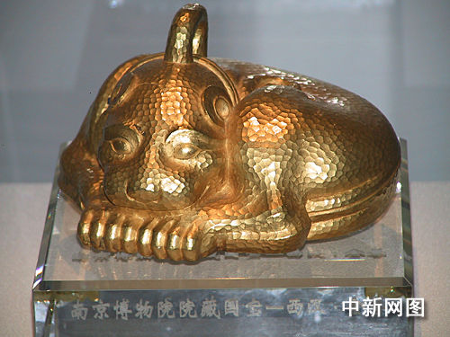 記者隔著玻璃窗看到,一只脖套項圈的金豹身覆鱗片,半蹲于座,鱗片在燈光映照下閃爍,光彩灼人,整座展品有著強烈的立體感。“這叫金獸,古時作保財鎮(zhèn)庫之用,迄今為止仍是中國出土文物中最大最重的金器”,南京市博物院院長龔良如是說。