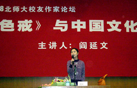 日前,女作家閻延文應(yīng)母校北師大文學(xué)院邀請(qǐng),在北師大針對(duì)文化熱點(diǎn)問(wèn)題,進(jìn)行了一場(chǎng)題為《色戒與中國(guó)文化》的講座。英東學(xué)術(shù)會(huì)堂,在講座開(kāi)始前即已爆滿(mǎn),兩個(gè)小時(shí)的講座始終處在熱烈氣氛中。