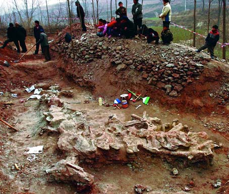 但一個小學生的意外發現,打破了郝嶺村的寧靜。“12月12日夜里,他們村的一個村民拿著一塊石頭去鄉政府找我們。”正在恐龍化石挖掘現場忙活的省地質博物館古生物研究室主任賈松海介紹說,當時他們正在汝陽縣劉店鄉另外一個村考察。那位找他們的村民反映說,他們那里有個小學生,這個孩子聽他同學說村里一塊坡地里有恐龍化石后,就自己偷偷挖了一小塊兒,后來,這件事被孩子的母親發現,她又告訴了同村人。