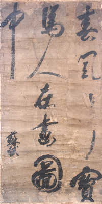 在中國書壇占有極重要地位的蘇軾,目前存世書法作品僅數十件,均藏于博物館,范圍也限于手卷、書帖、橫披等中小字形。“《春風》這件姍姍來遲的‘大手筆’,彌補了因缺乏大幅作品而導致的蘇派書法體系的不完整。”徐啟雄昨天說,“數月前,一位外地收藏者帶藏品來杭州找我鑒定真?zhèn)!毙靻⑿弁嘎,這幅僅存內芯、名為《春風》的中堂大軸草書高165厘米、寬65厘米,紙面發(fā)黃發(fā)暗,部分已腐化剝落,落款為“蘇軾”,另有“蘇軾”、“東坡居士”兩方隱約可辨的印章。上書“春風寶馬人在畫圖中”,“春風”后缺一字,其余每字高、寬在30-60厘米,最后的“中”字高62厘米。
