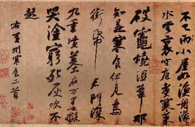 在現存蘇軾書帖中,徐啟雄以《春風》中9字與在蘇軾部分字帖中對應的字比較,發(fā)現其字形、筆跡等很像;用“比對法”逐筆分析《春風》與各帖字形、構成特征、行筆習性、書寫規(guī)律等,基本判定為同一人所作;用“解碼法”,《春風》的符號特征與各帖中的字也極為相似,如“圖”字的“口”狀似圓圈;“中”、“人”字收筆戛然而止、了無痕跡。
