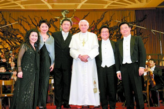 隨后,教皇走上舞臺與余隆和幾位歌唱家握手,并發表了5分鐘的演講,教皇表示昨晚的演出是一份稱心如意的禮物,“事實上這個音樂會在某種程度上讓我們接觸到中國社會活潑輕快的現實,在這群出色的藝術家身上,我們可以看到他們所代表的偉大中國文化和音樂傳統,他們的演繹也幫助我們更了解一個民族的歷史”。在講話最后,教皇竟然出人意料的用中文說出“感謝大家并祝愿大家一切順利”,并主動邀請幾位藝術家一起合影,這也是教皇回贈給中國藝術家的禮物。