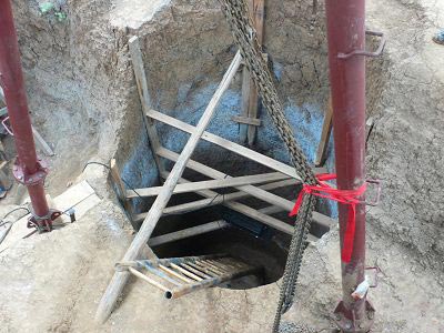 昨天下午,早報(bào)記者來到考古現(xiàn)場(chǎng),看到一個(gè)小型起吊機(jī)已深入“井內(nèi)”。據(jù)介紹,圓形的地宮如同一口深井,直徑2.2米,在圓井的正中間,還發(fā)現(xiàn)四塊石板拼起的方框,未見滲水,放有一層銅錢。華國榮表示,結(jié)構(gòu)和內(nèi)容正在逐步認(rèn)識(shí)過程中。