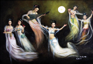 朱澤斌還講述了靈感的來源:“一輪月光照著寒冷朦朧的天空,6個(gè)仙女在廣寒宮周圍飛翔著、舞蹈著。她們身穿著宮衣、游泳衣和運(yùn)動衣組合的服飾,飛到一起來了,飛向了廣州。去年中秋節(jié)凌晨,此情此景進(jìn)入了我的夢中。第二天醒來,我把夢中見到的便作了這幅畫。”