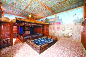 上午,記者在修復完工的倦勤齋內看到:倦勤齋共面闊9間,以木裝修隔成了上下兩層的凹字形仙樓。最巧妙的是,齋內各房間之間均以隔扇、檻窗、落地罩、炕罩等隔成相對獨立的空間。齋內用歐洲透視方法繪出的絹面通景畫覆蓋了整個房間,據介紹整個倦勤齋有70余張畫,其中頂棚處有12張,全部約170平方米,如此大量反映18世紀歐洲美學對中國裝飾藝術影響的通景畫,不僅在紫禁城而且在全中國也是絕無僅有的。當年乾隆皇帝觀戲的小戲臺被裝飾得古色古香,戲臺上方的天花板上全部都是枝藤茂密的紫羅蘭圖案通景畫,房間的墻壁上則細膩地描繪了紫禁城里的建筑和山石景色。而在以仙樓圍成的中廳內,精美的竹絲鑲嵌、玉雕和木雕藝術同樣令人嘆為觀止。