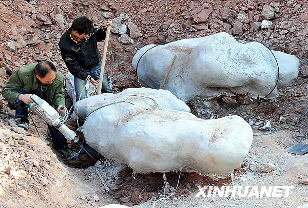 在汝陽縣劉店鄉圣水溝村,工作人員將挖掘出的大型恐龍化石經過科學分割后打上石膏,以便妥善保存(12月1日攝)。新華社記者 王頌 攝
